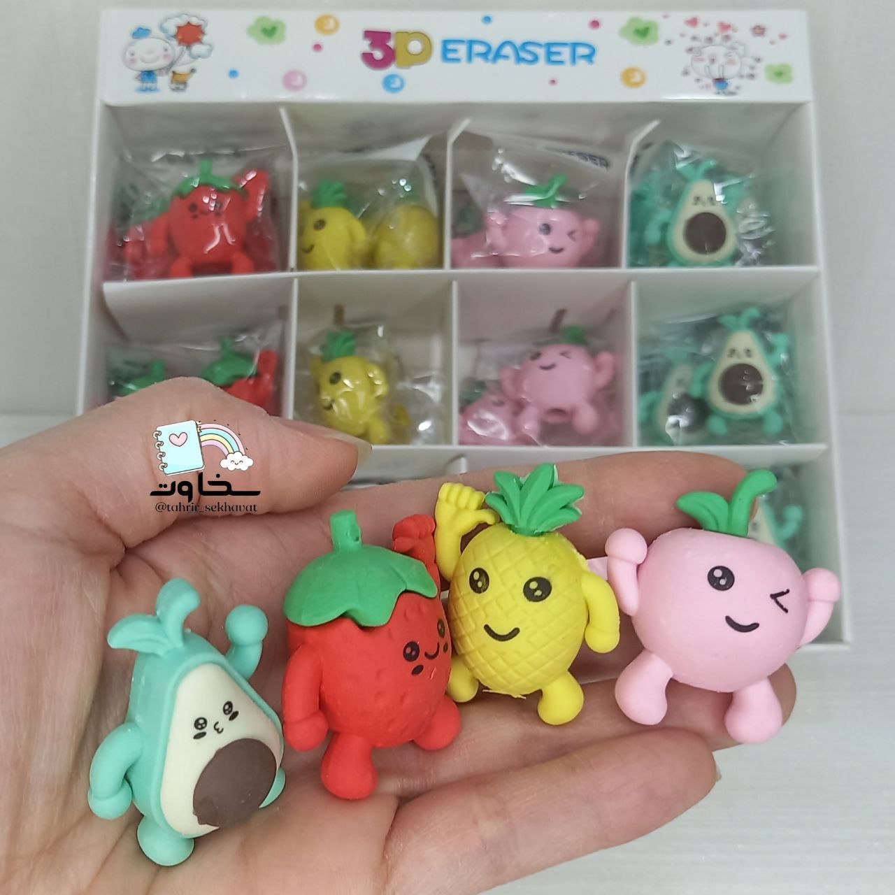 پاکن سرمدادزی با طرح میوه، نرم و جذاب، مناسب استفاده روزانه و مدرسه. موجود در بسته ۳۶ عددی.