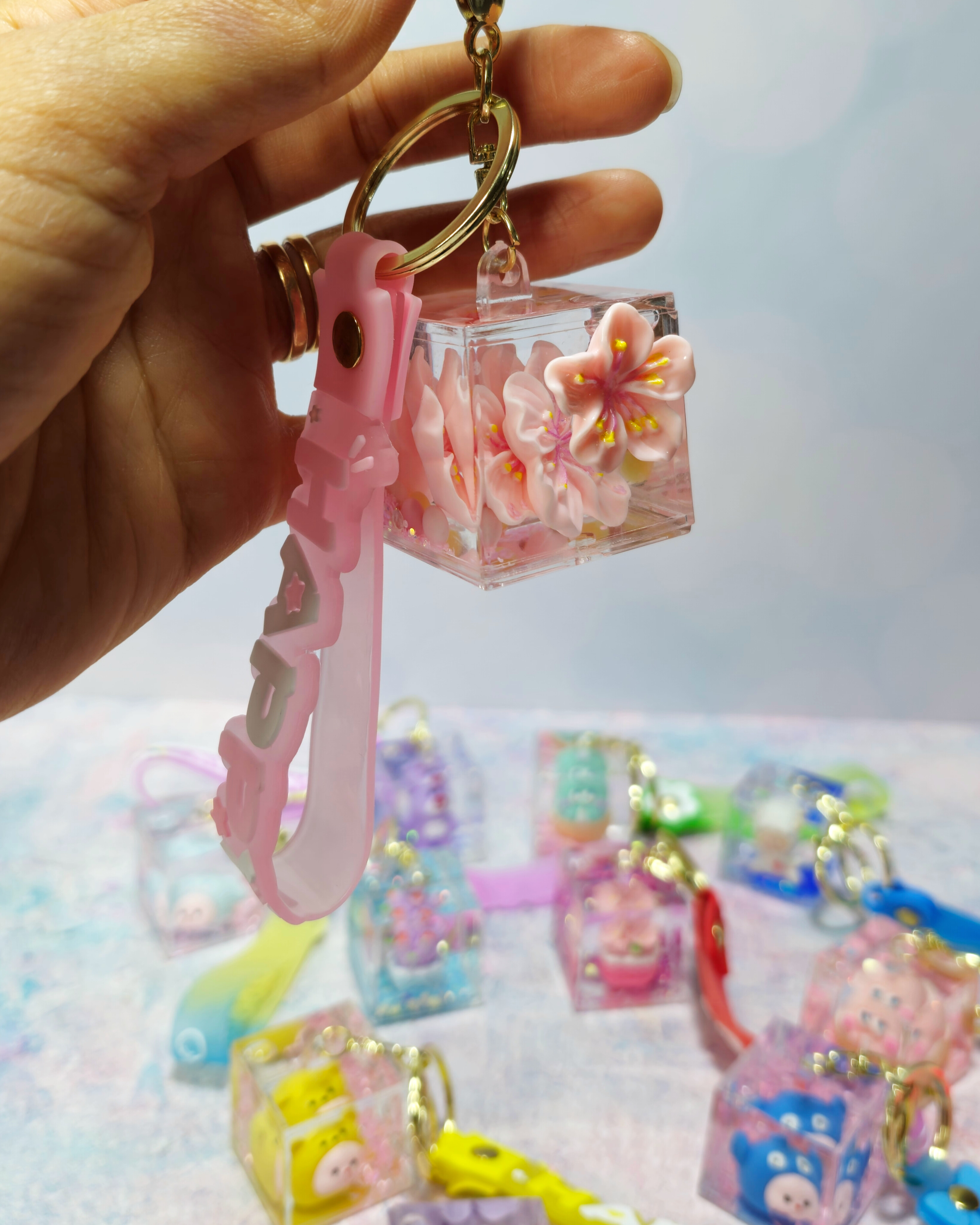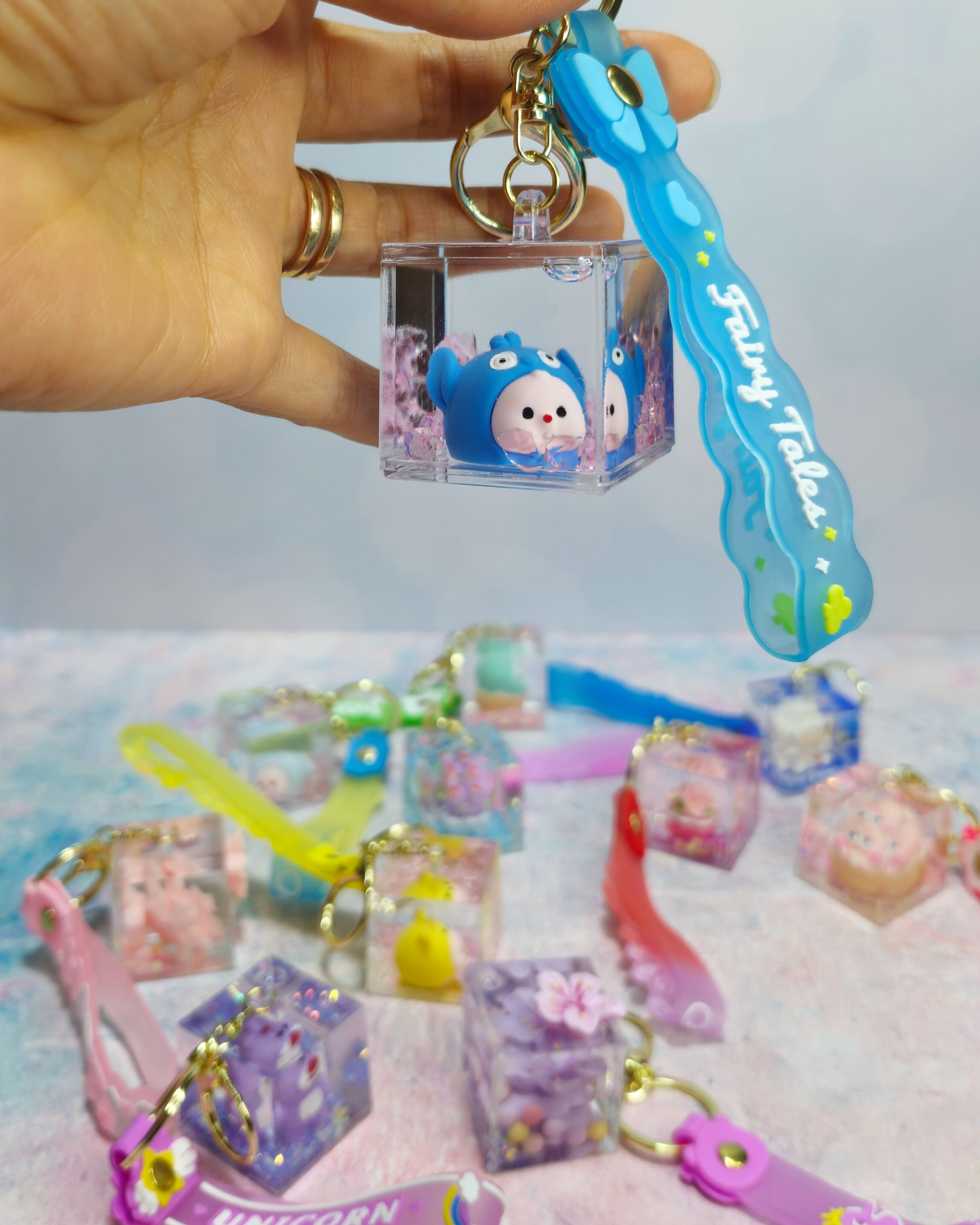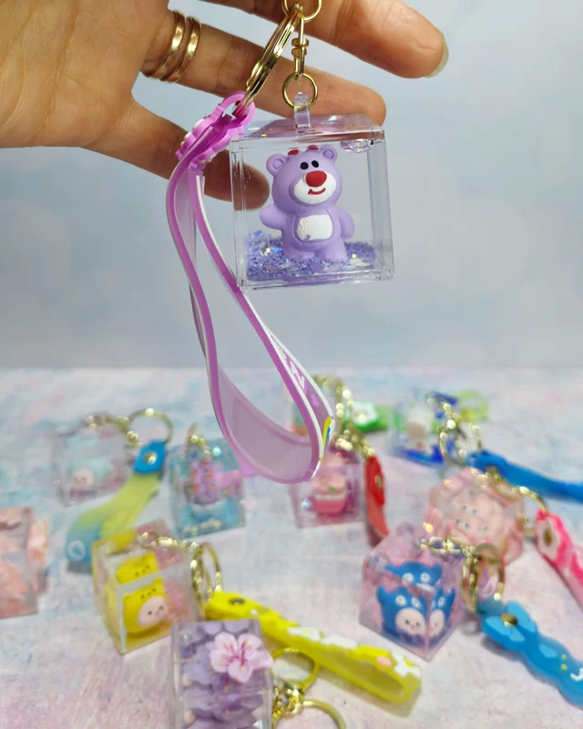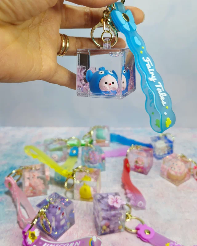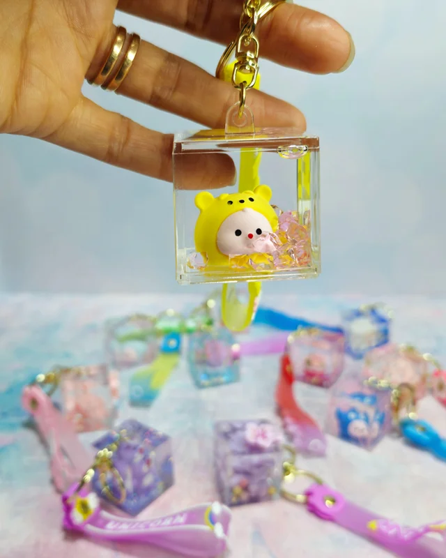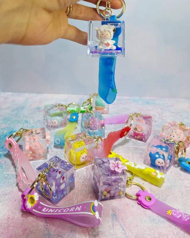 - جاکلیدی با طراحی مکعبی و رنگهای متنوع 🟦 - آکواریومی و پر از آب و پولکهای براق - ایدهآل برای کلیدها، کیف و استفاده روزمره - بسته ۱۲عددی، مناسب خرید گروهی یا هدیه دادن