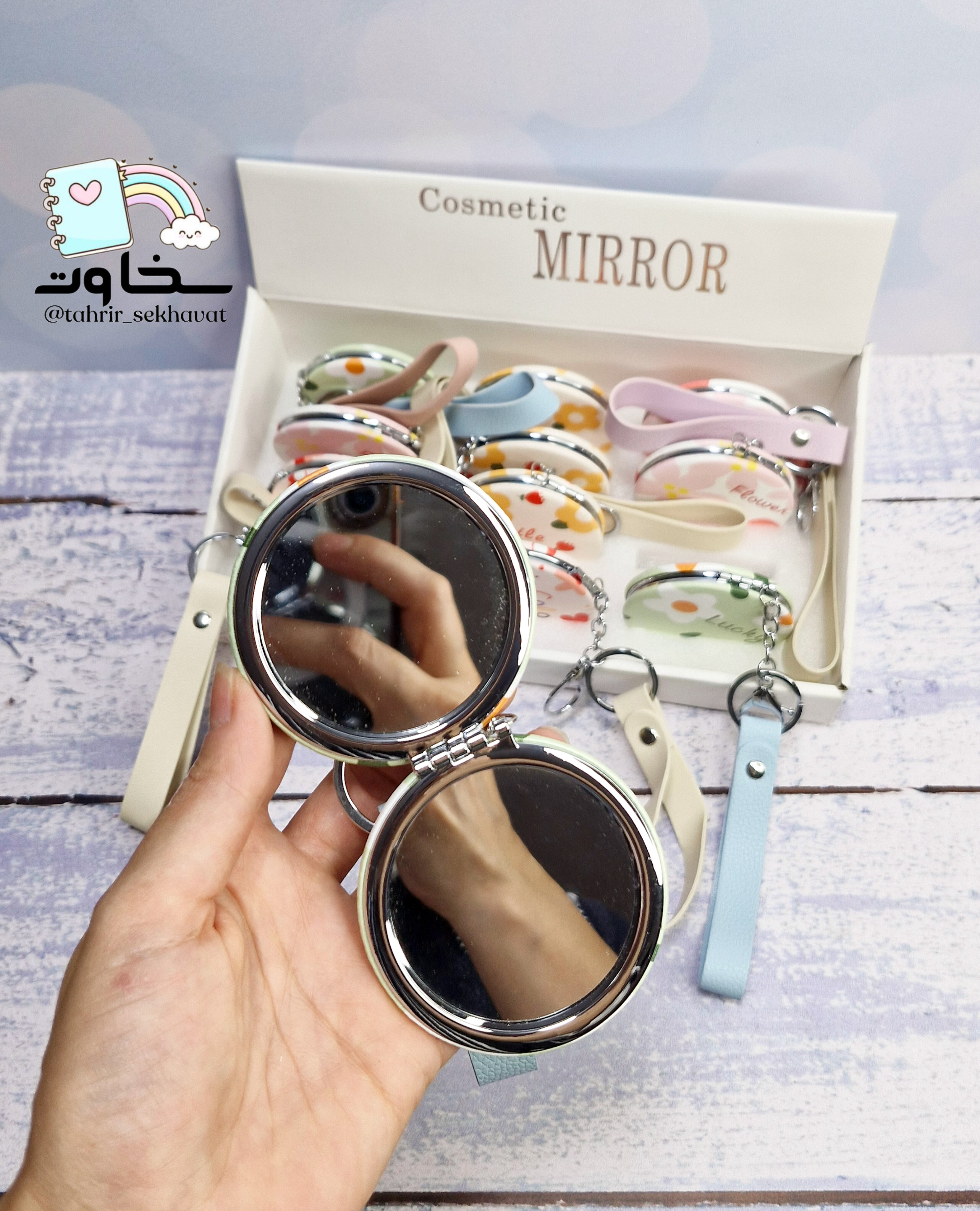 آینه جیبی طرح گل دوقلو، یک انتخاب کاربردی و زیبا برای همراه داشتن در کیف و سفر است. هر بسته شامل ۱۲ عدد آینه است که طراحی دوقلو دارد: یک آینه بزرگ برای مشاهده کامل و یک آینه معمولی برای جزئیات. این آینهها با بند آویز چرمی همراه شدهاند تا به راحتی قابل حمل باشند و جلوهای شیک و فانتزی به کیف یا لوازم شخصی شما ببخشند. طرح گل و رنگبندی جذاب آنها، این محصول را به هدیهای مناسب و دوستداشتنی تبدیل کرده است.