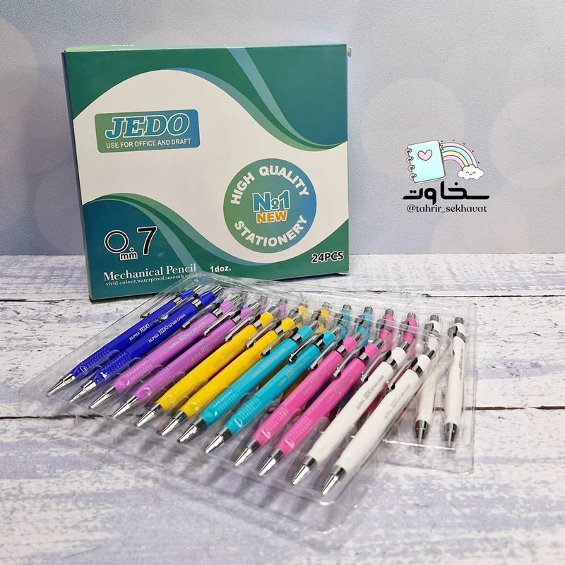 بسته ۲۴ عددی اتود جیدو با طراحی خاص و بدنه سه گوش، رنگهای جذاب و شاد، و ضخامت نوک ۷ دهم، مناسب برای نوشتن دقیق و راحت.