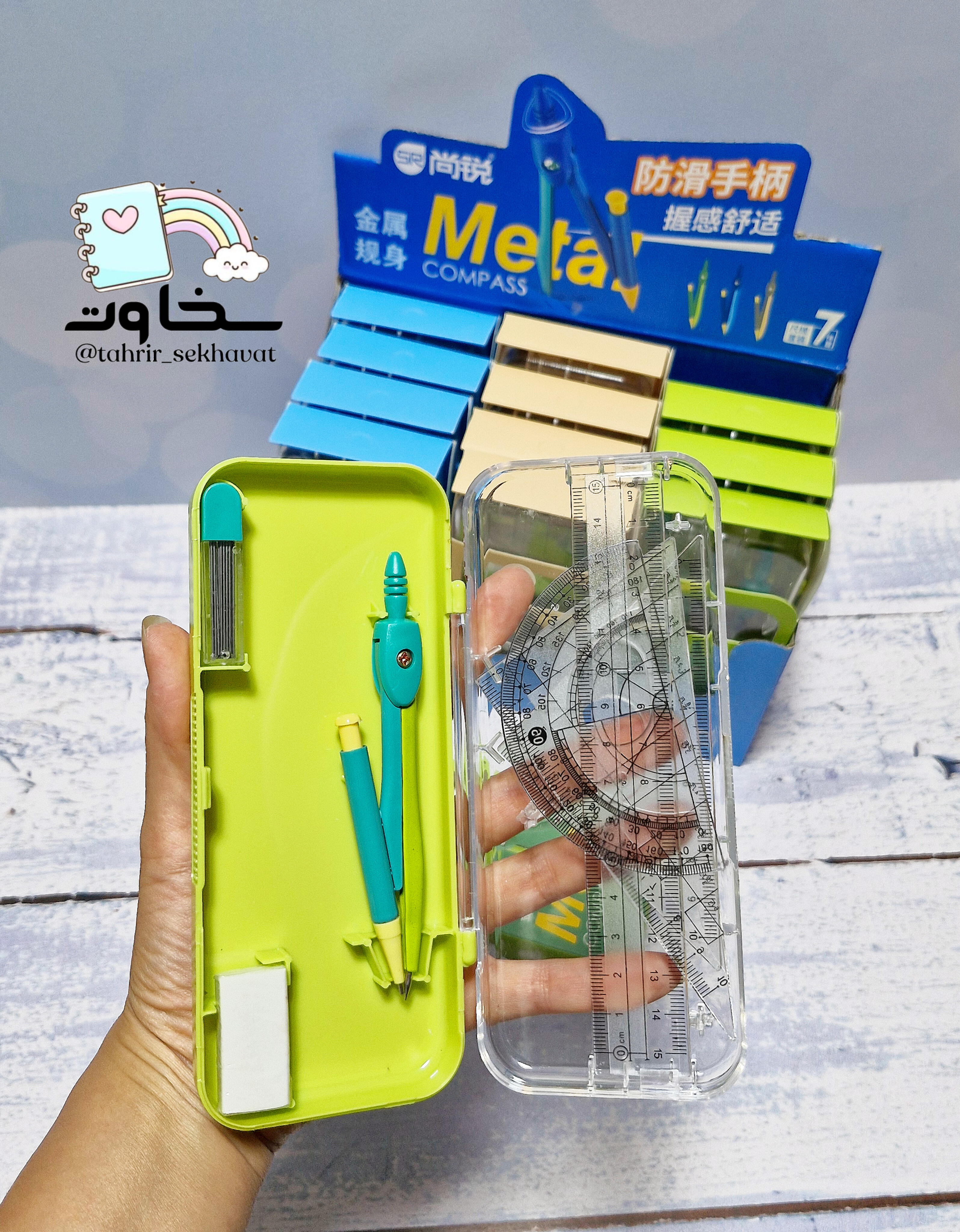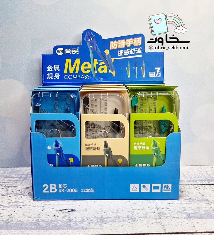 ست پرگار فلزی که شامل ۷تکه کاربردی میباشد(پرگار،خطکش، گونیا،نقاله...)بدنه رنگی و بسیار زیبا مناسب دانشآموزان