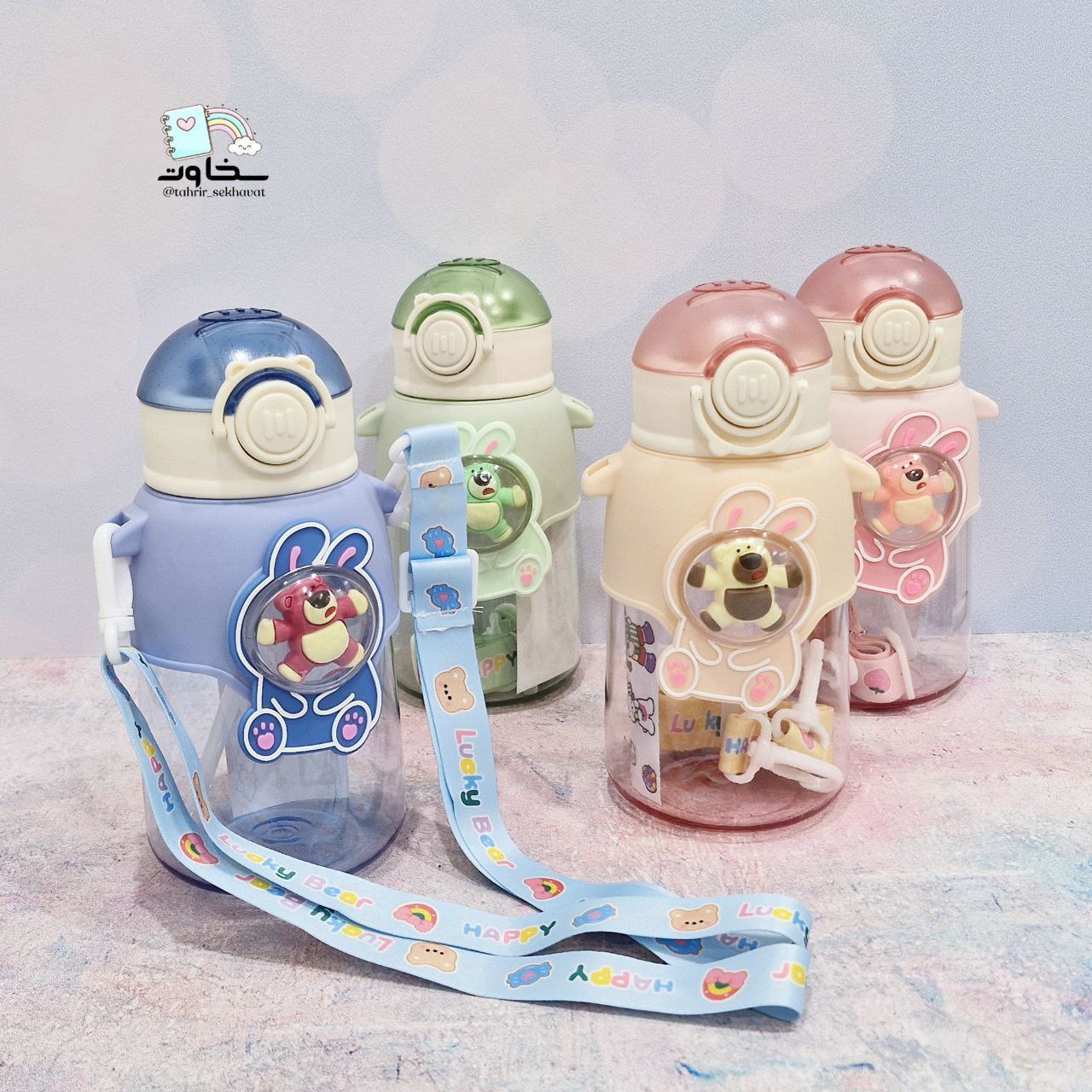 قمقمه وارداتی نی دار خرسی دارای بند آویز و استیکر گنجایش ۶۵۰میل و رنگهای پاستلی زیبا.پک ۸عددی برای خرید عمده .